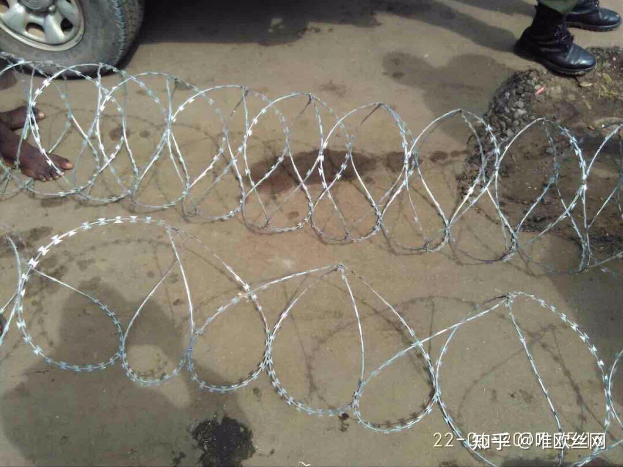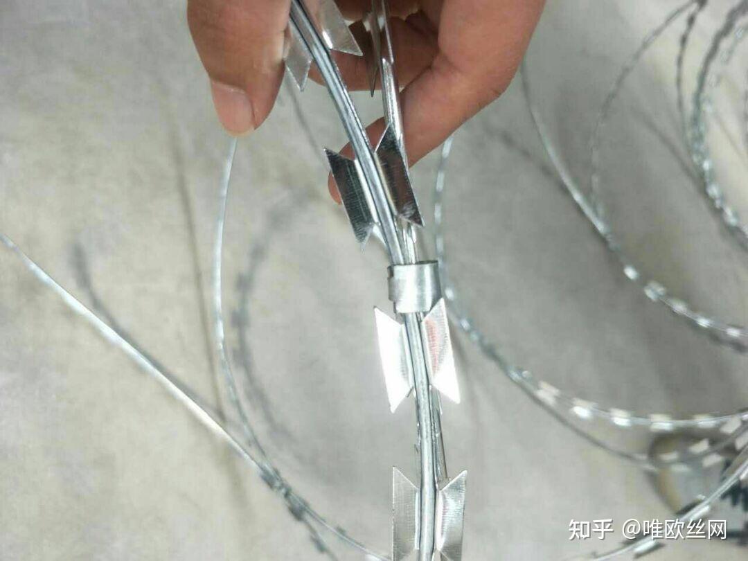 其实不懂的人们还不知道,它还分单螺旋和双螺旋,我们普通常用的是双螺旋刀片刺绳,也叫环形刀片刺网,刀片刺网由热镀锌钢板或不锈钢薄板冲压出尖锐的刀片状,高张力镀锌钢丝或刀片刺绳者不锈钢丝做芯线组合而成的阻绝器材。由于刺网造形独特不易触摸,因而能达到很好的防护隔离效果。产品的主要材质有镀锌板和不锈钢板。它是由相邻两根刀片刺网用卡扣来卡住,来形成刀刺网的双层牢固性。这样使展开的刀刺网密度更密一些,防盗效果也更强。一般小区、学校、许多国家的工矿企业、园林公寓、边防哨所、军事领域、监狱、看守所、政府建筑物和其他国家的安全设施。